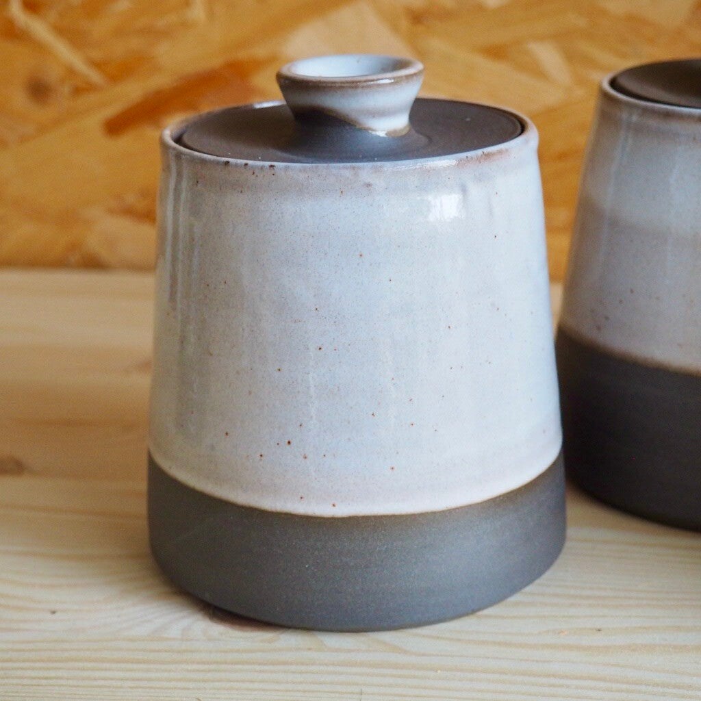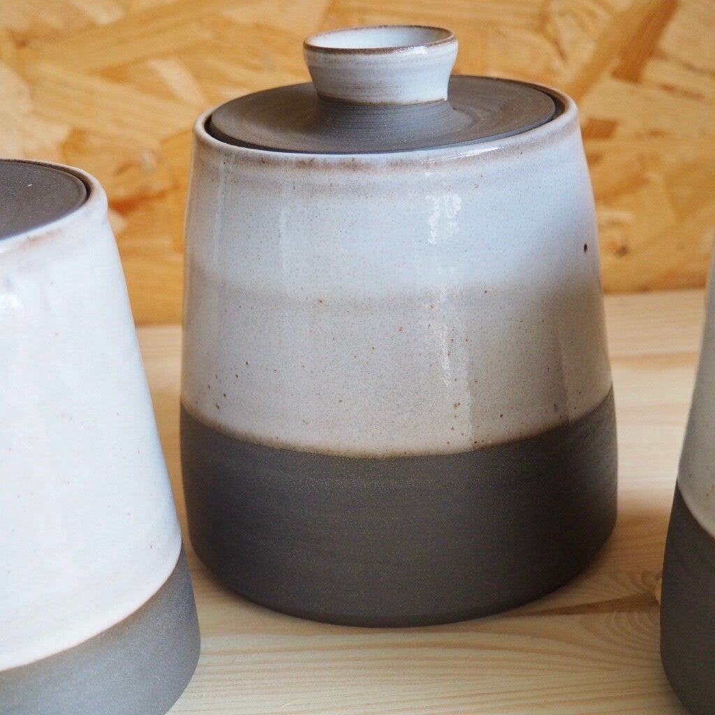 Deze dekselpotten, gemaakt met grijze klei wit glazuur passen prachtig in elk interieur. Misschien om je keuken wat te organiseren of misschien gewoon als eye catcher?
