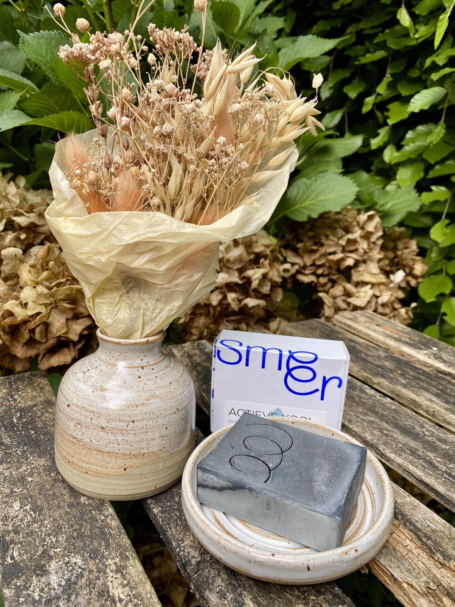 1x vaasje + boeketje droogbloemen van stukske geluk