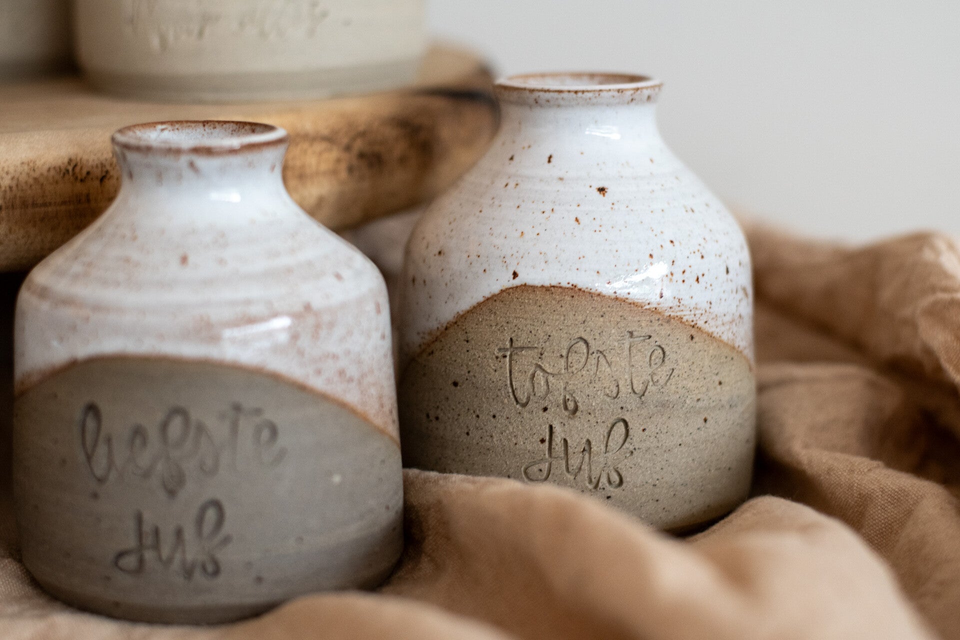 Deze vaasjes zijn gedraaid in multiklei met een witte glazuur over.