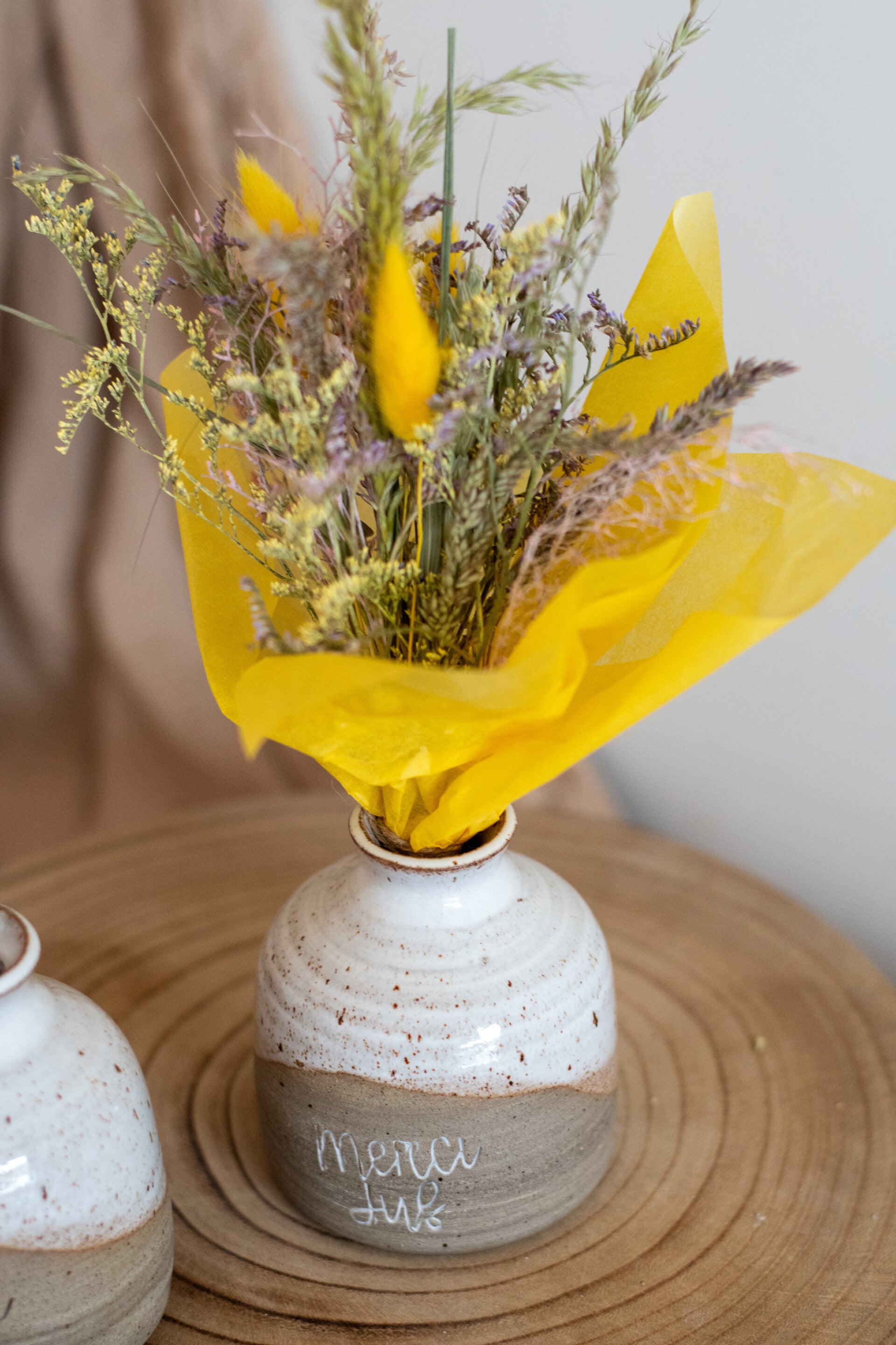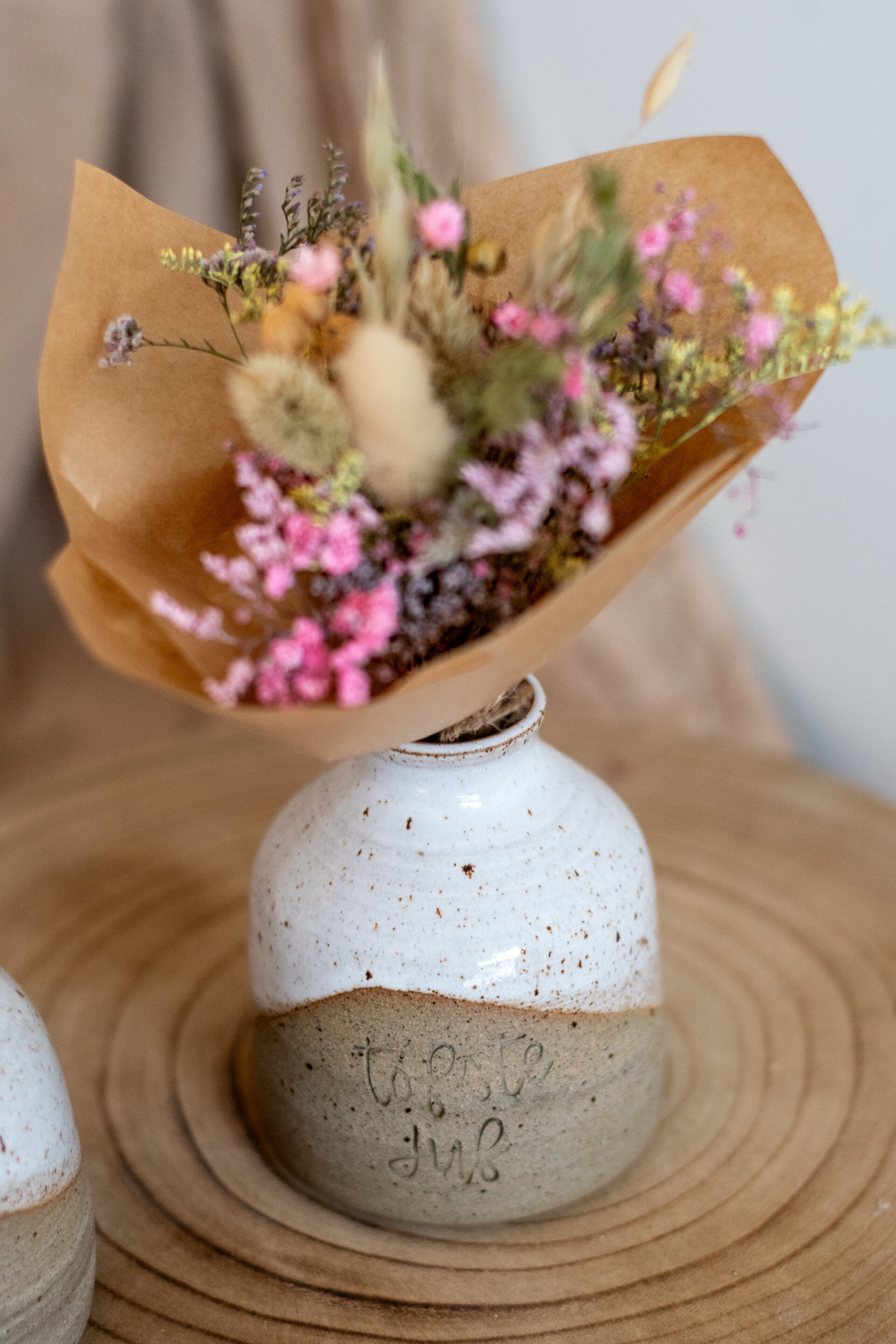 De vaasjes kan je al dan niet met een boeketje droogbloemen bestellen.